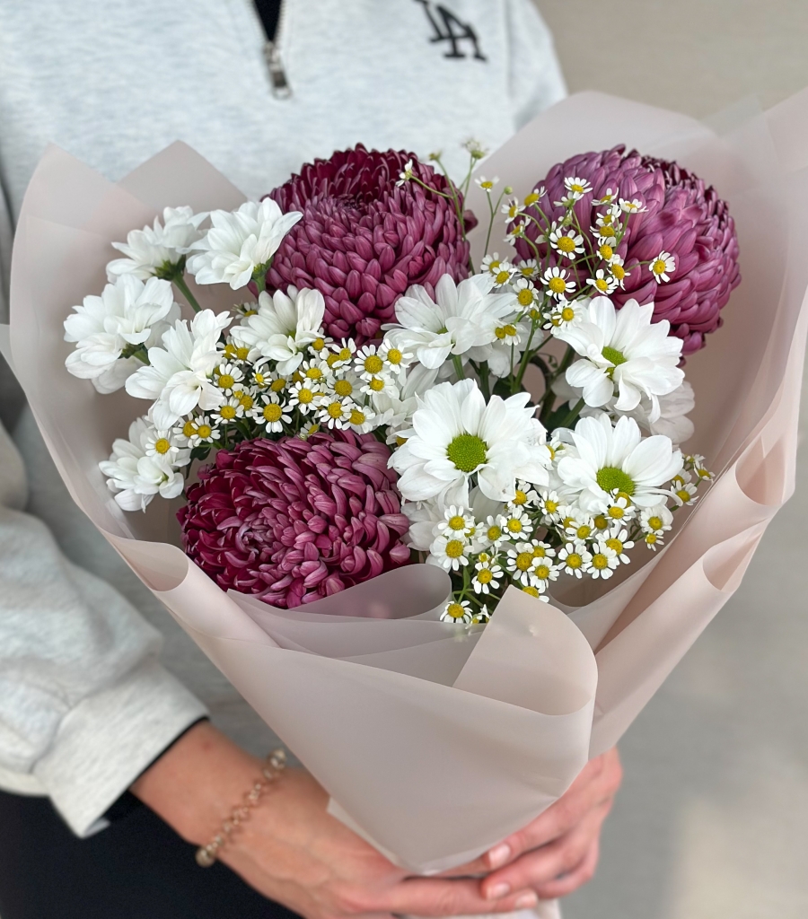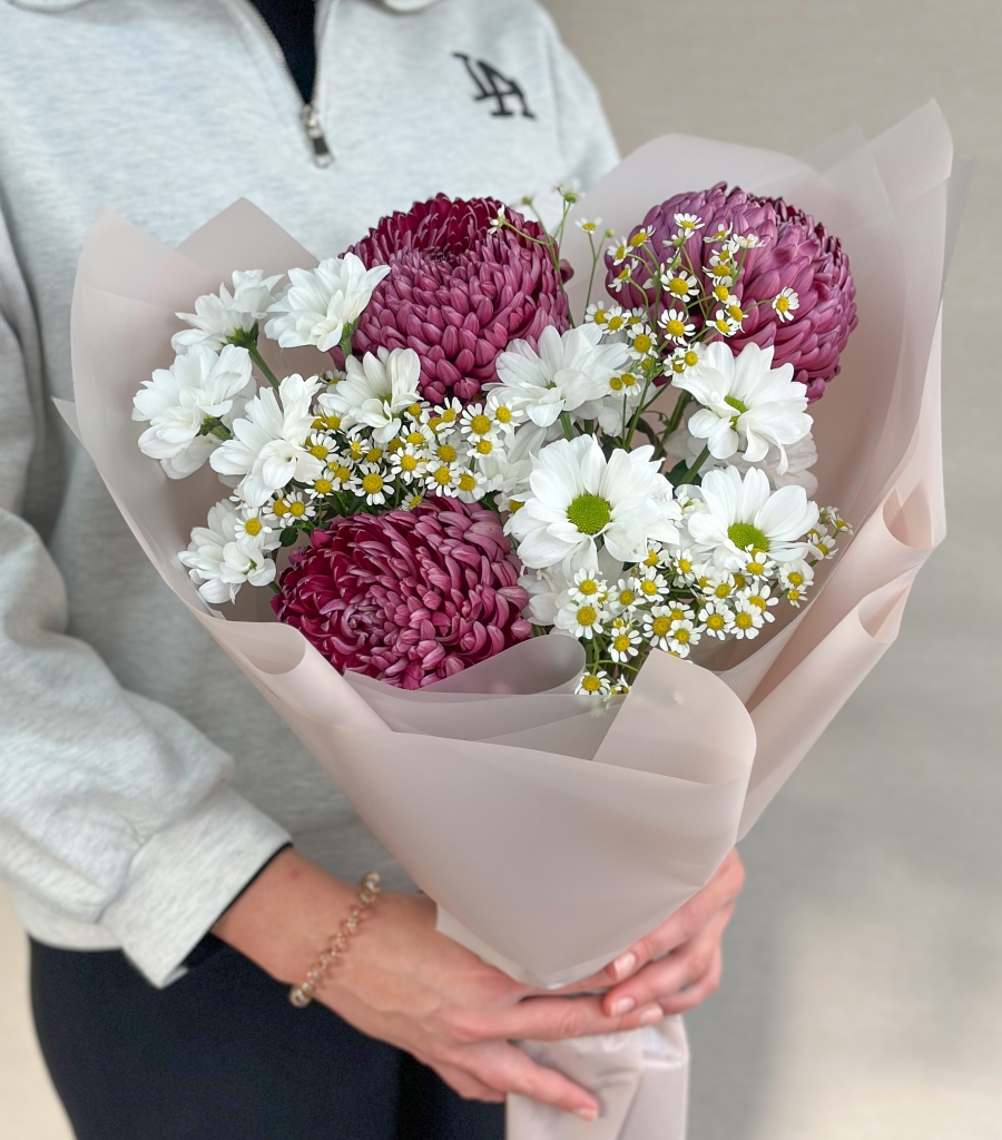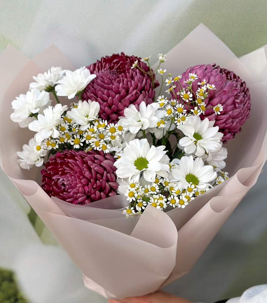 Танацетум - 3 шт. Упаковка - 1 шт. хризантема бигуди - 3 шт. хризантема ромашка белая - 2 шт.