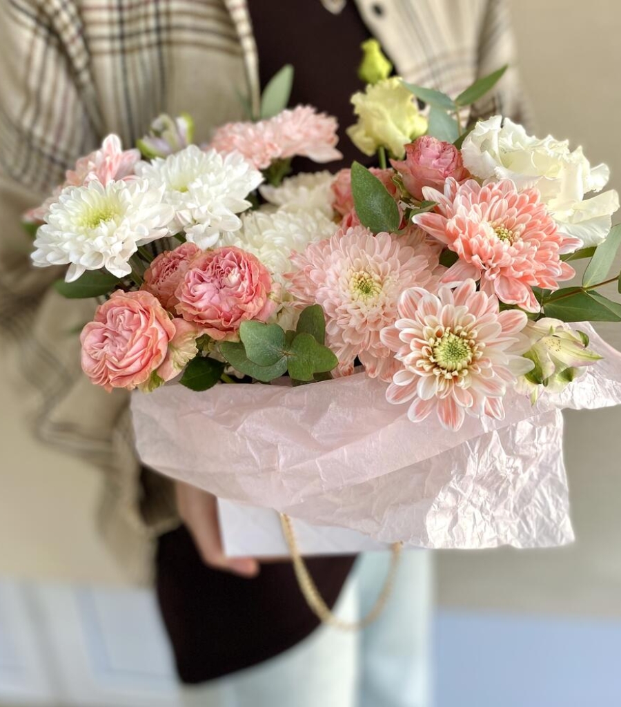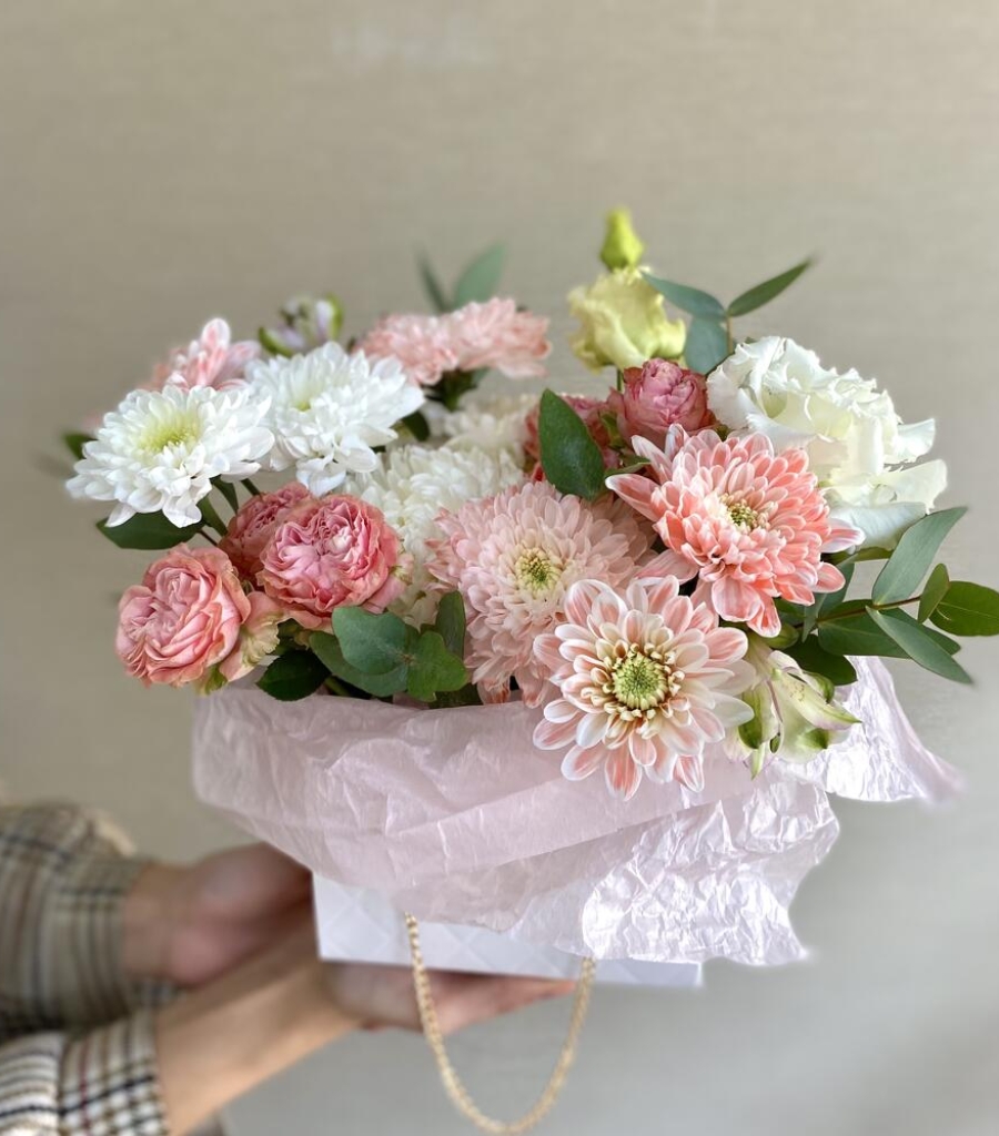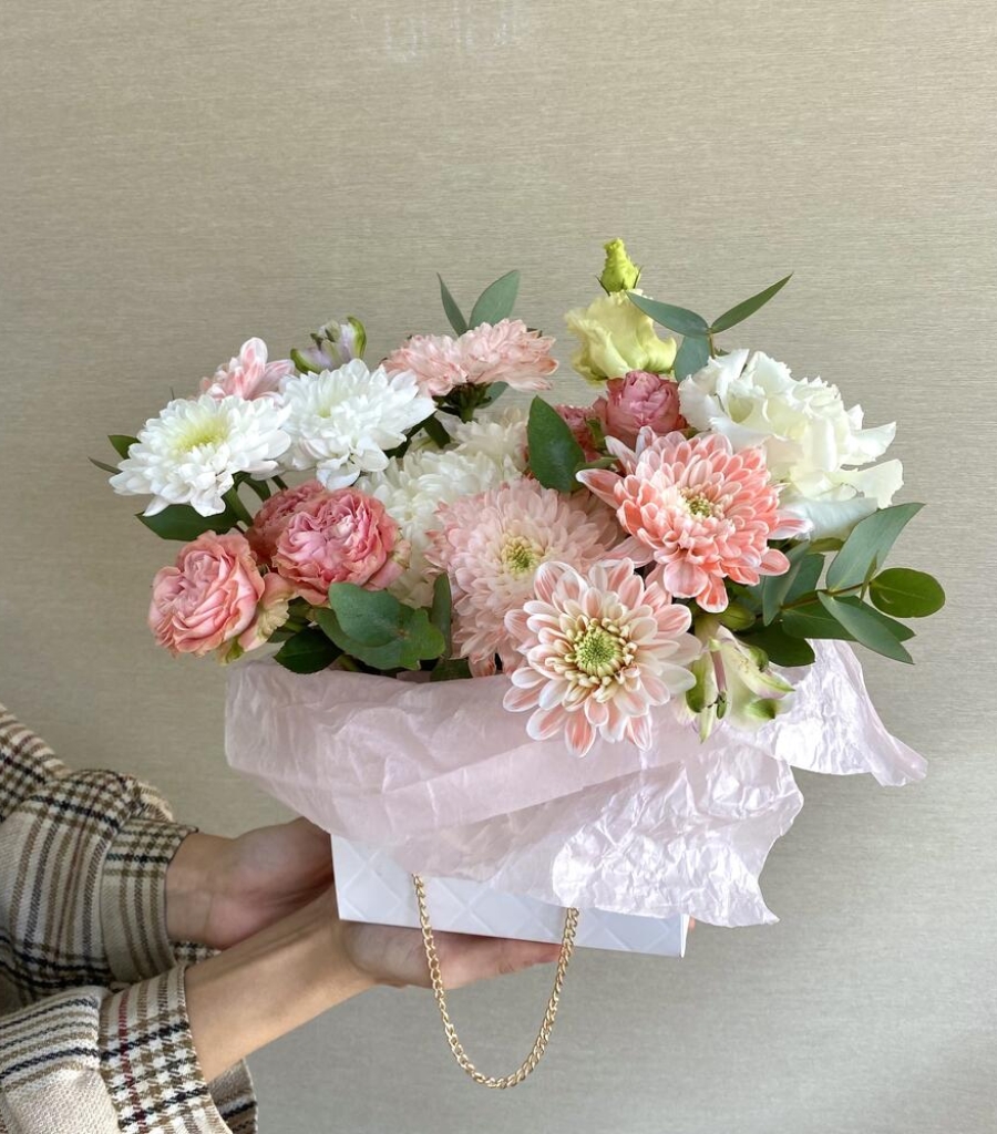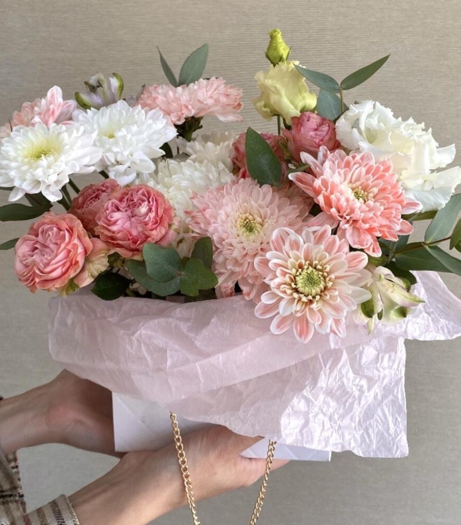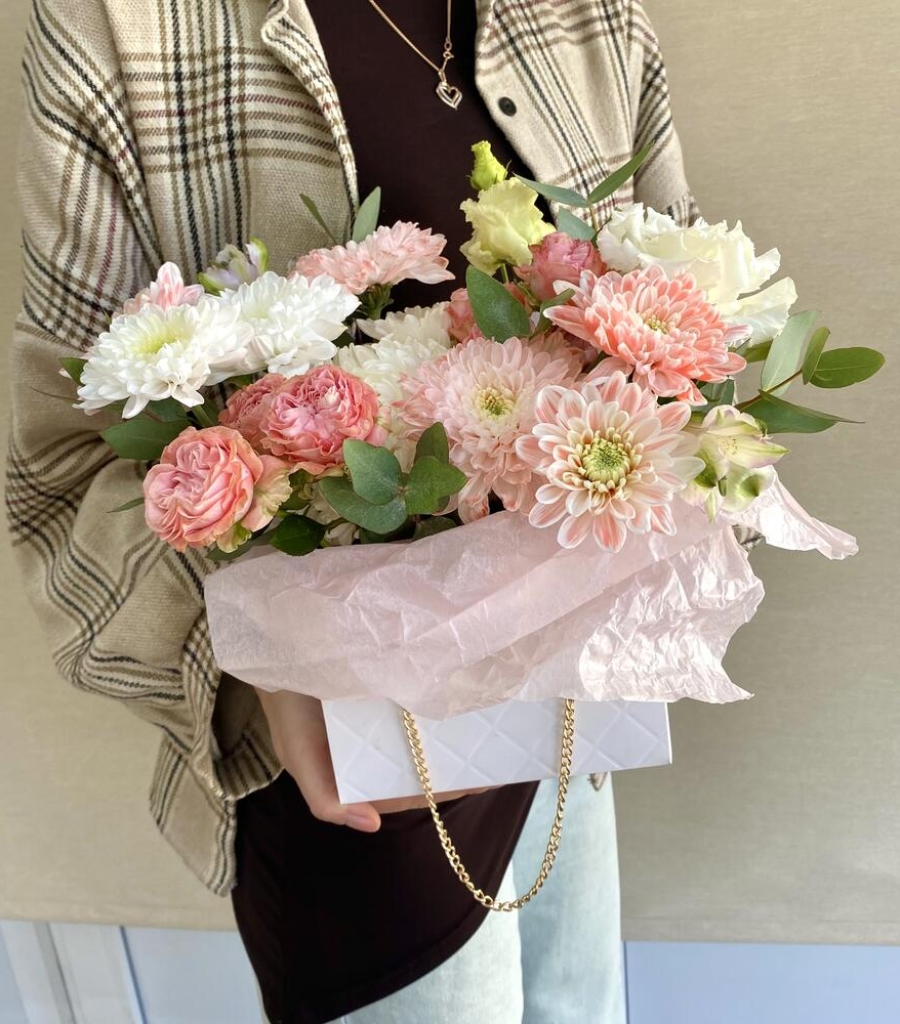 Альстромерия - 1 шт. Хризантема кустовая - 1 шт. Эвкалипт - 1 шт. Хризантема одноголовая белая - 1 шт. Мадам бомбастик - 2 шт. хризантема кустовая персиковая - 1 шт. сумочка с цепочкой - 1 шт.