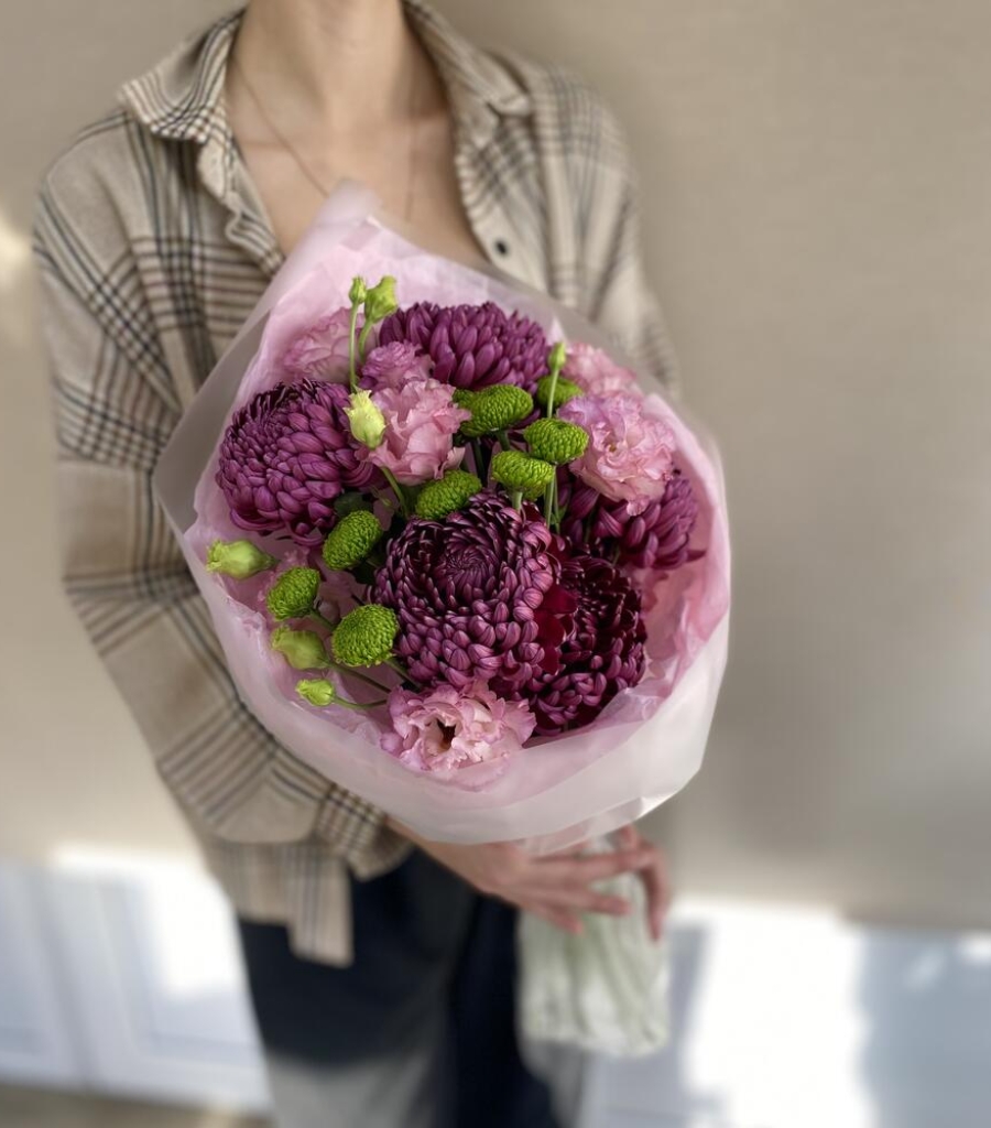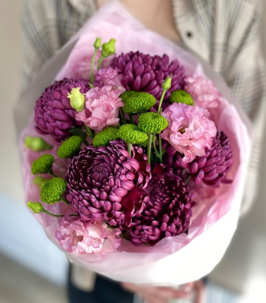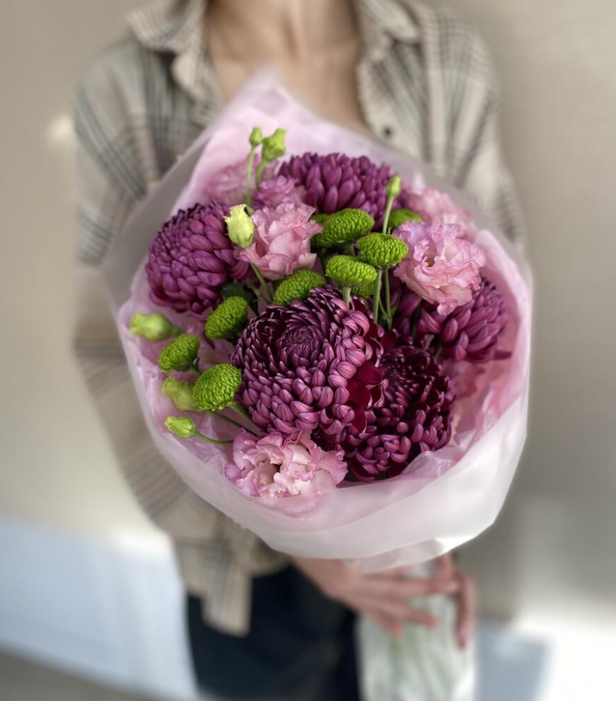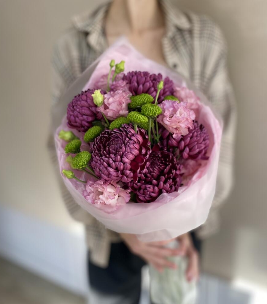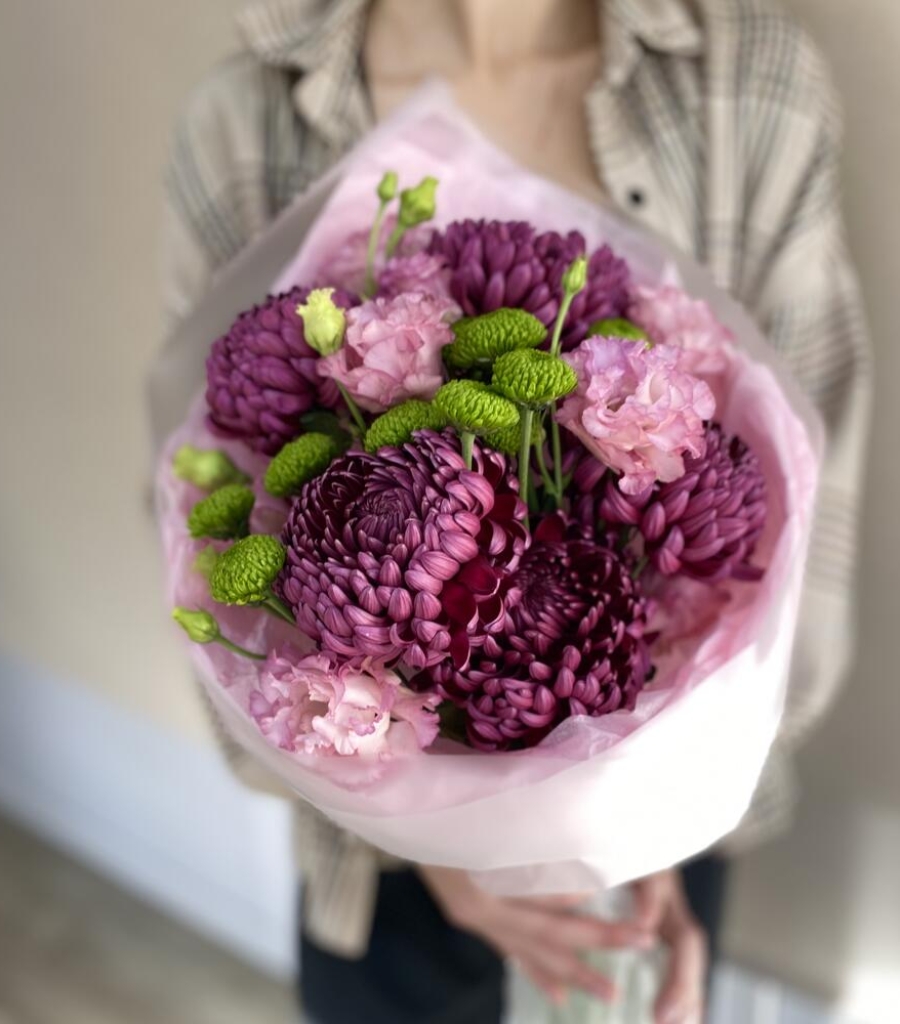 Эустома - 3 шт. Упаковка дизайнерская - 2 шт. Кризал (подкормка) - 1 шт. инструкция по уходу за цветами - 1 шт. хризантема одноголовая бигуди - 5 шт. хризантема делигрин - 2 шт.