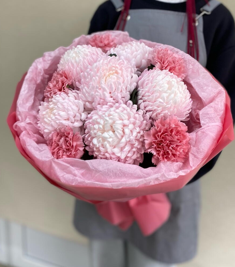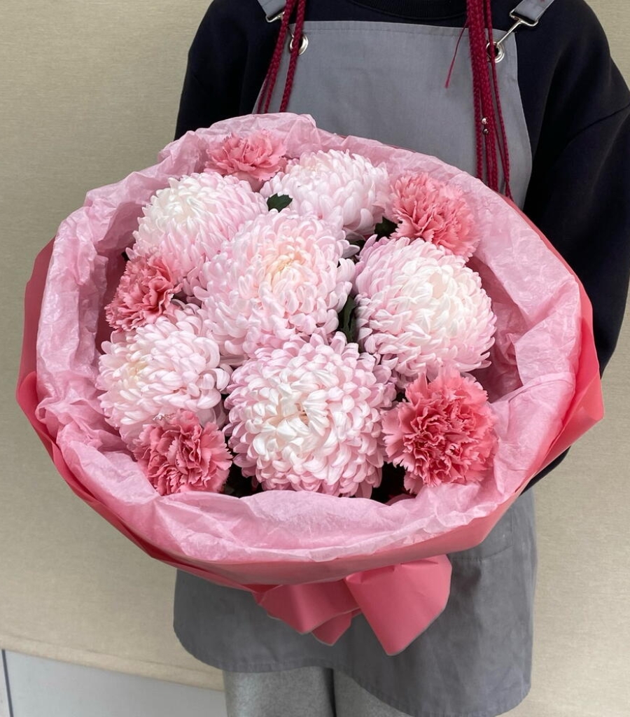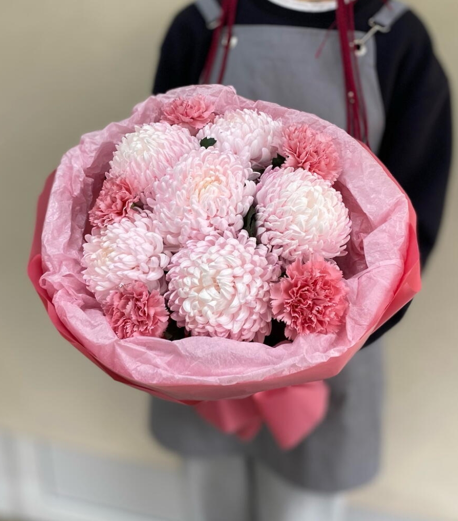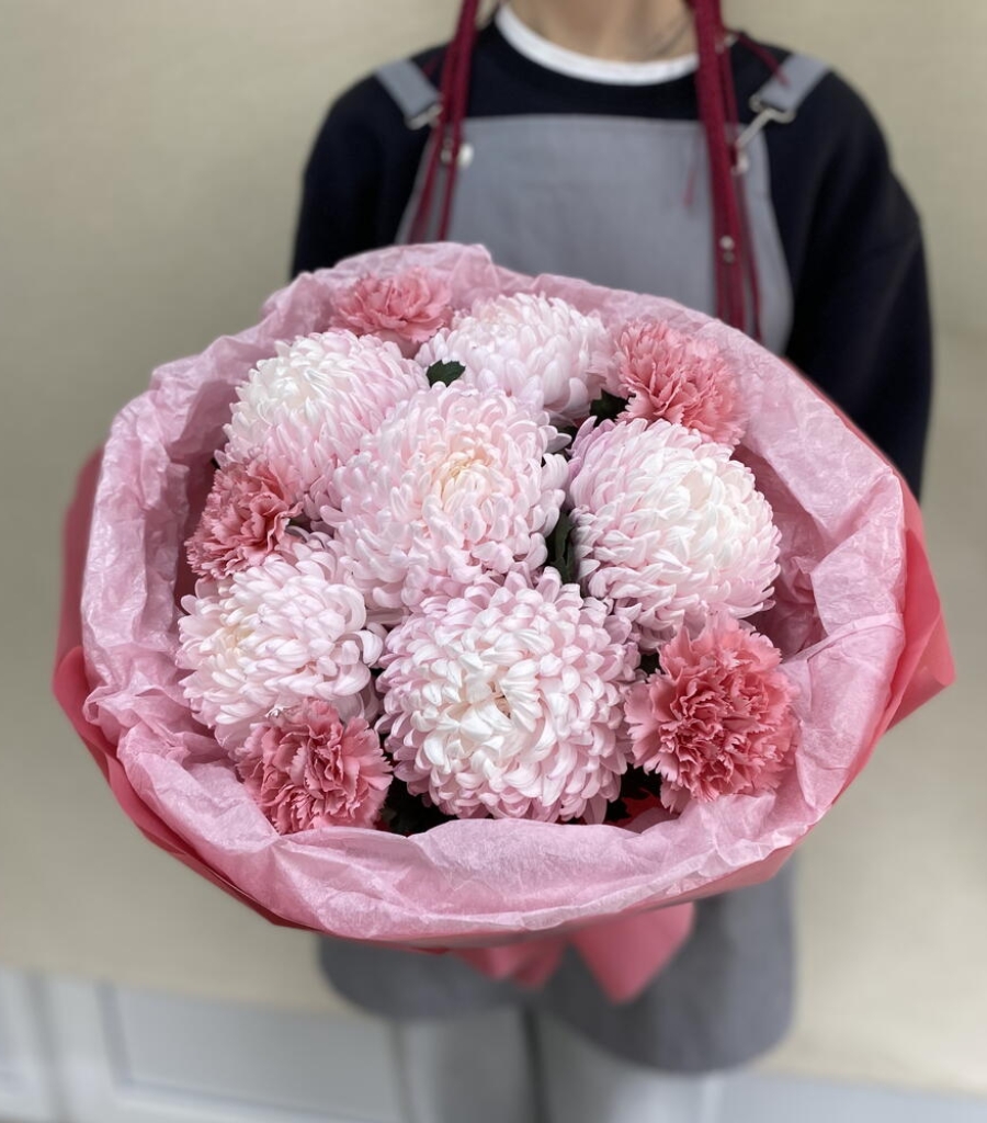 Упаковка дизайнерская - 2 шт. Хризантема одноголовая розовая - 6 шт. Диантус розовый - 5 шт. инструкция по уходу за цветами - 1 шт. кризал подкормка - 1 шт.