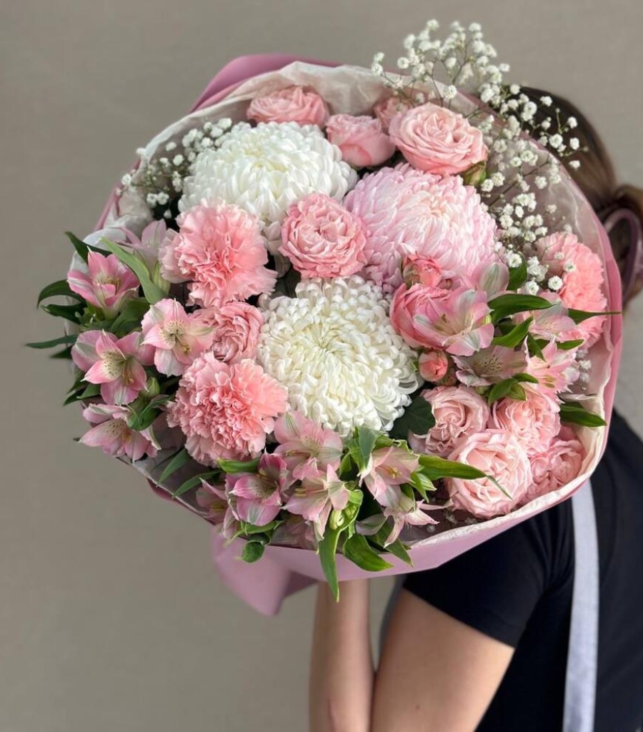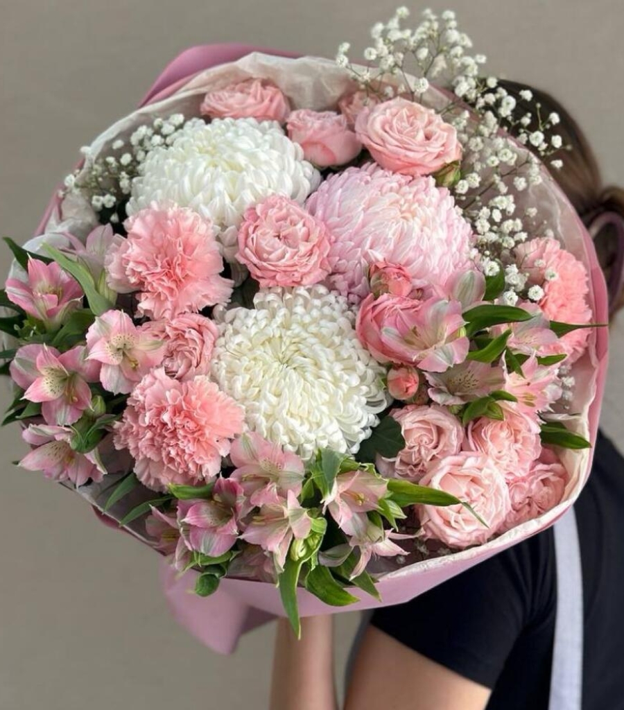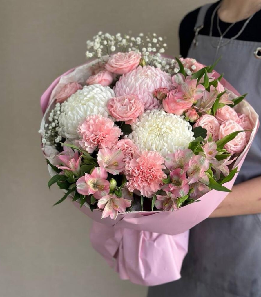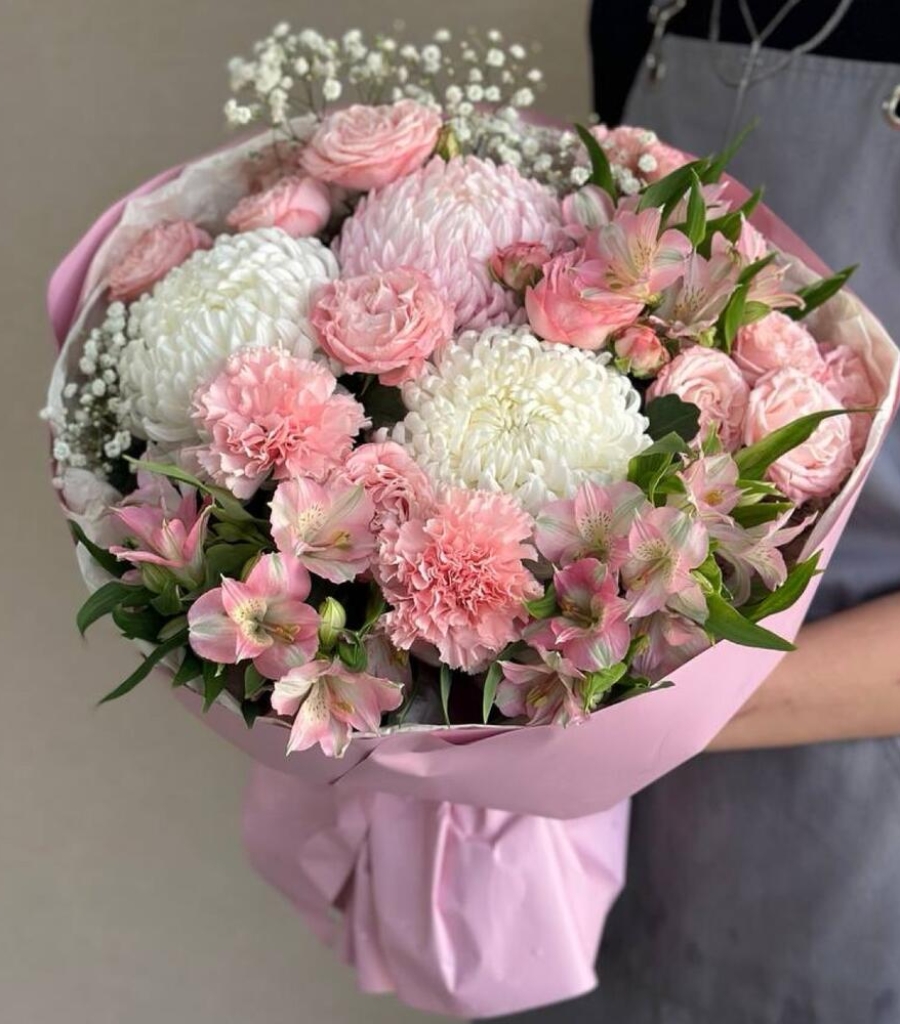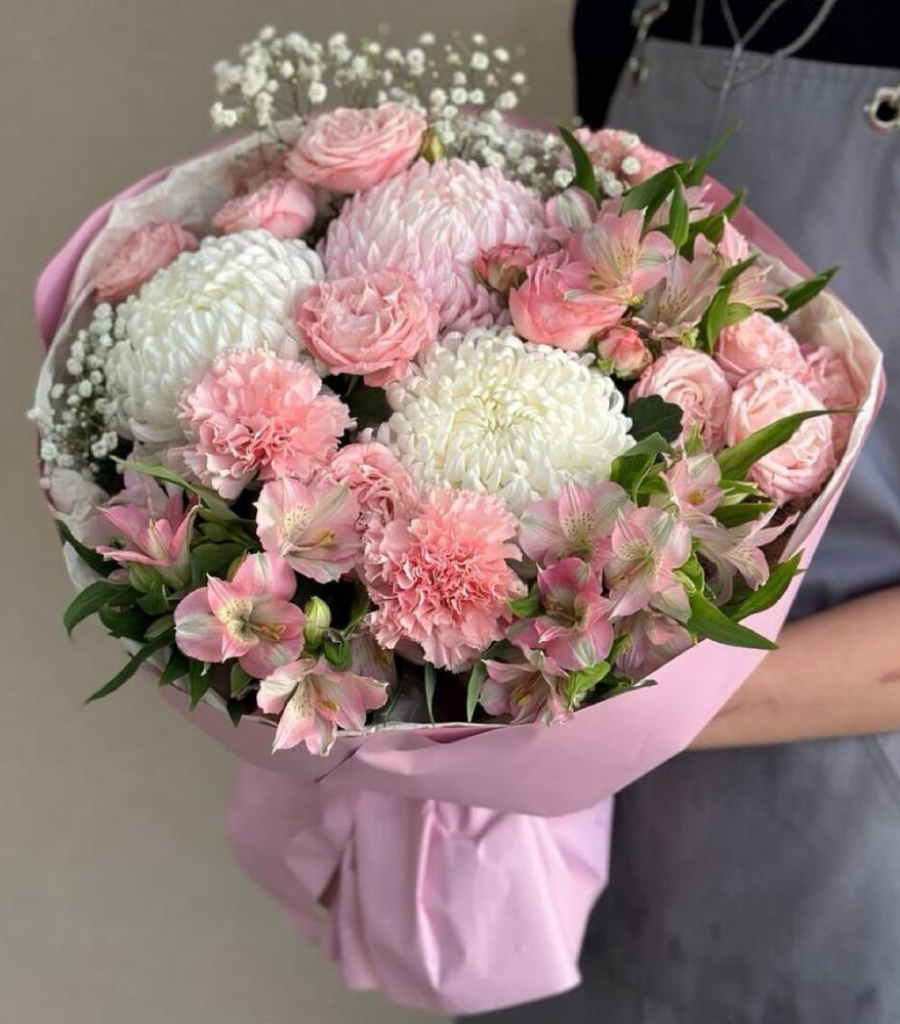 Альстромерия - 3 шт. Упаковка дизайнерская - 2 шт. Кризал (подкормка) - 1 шт. Хризантема одноголовая белая - 2 шт. Хризантема одноголовая розовая - 1 шт. Диантус розовый - 3 шт. Гипсофила Белая - 1 шт. инструкция по уходу за цветами - 1 шт. мадам бомбастик кустовая роза - 3 шт.