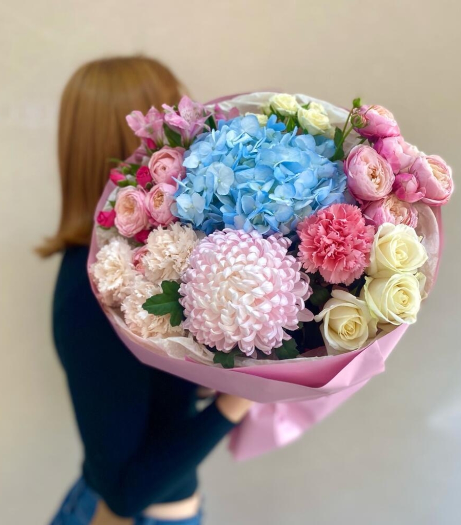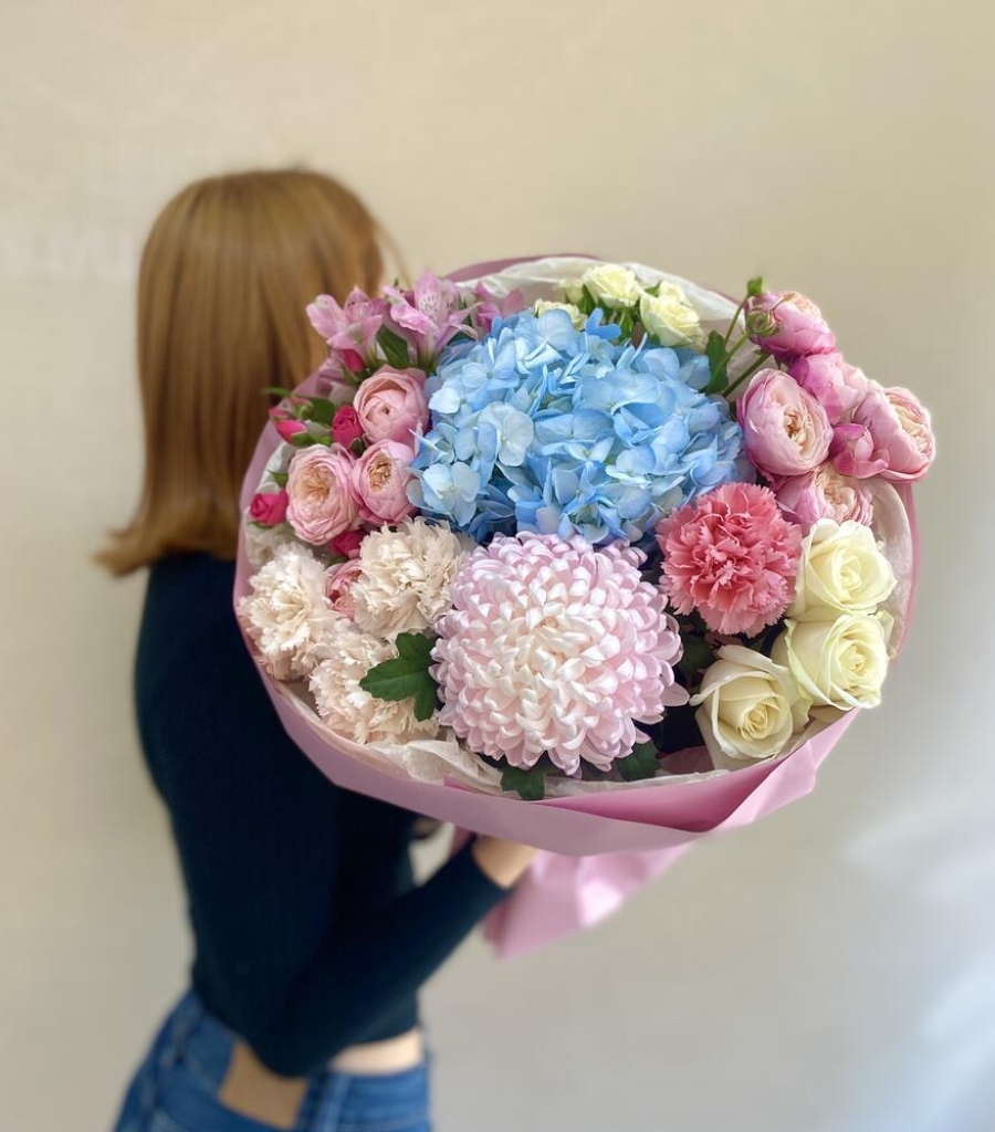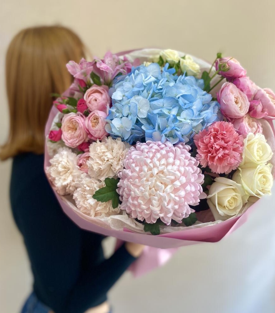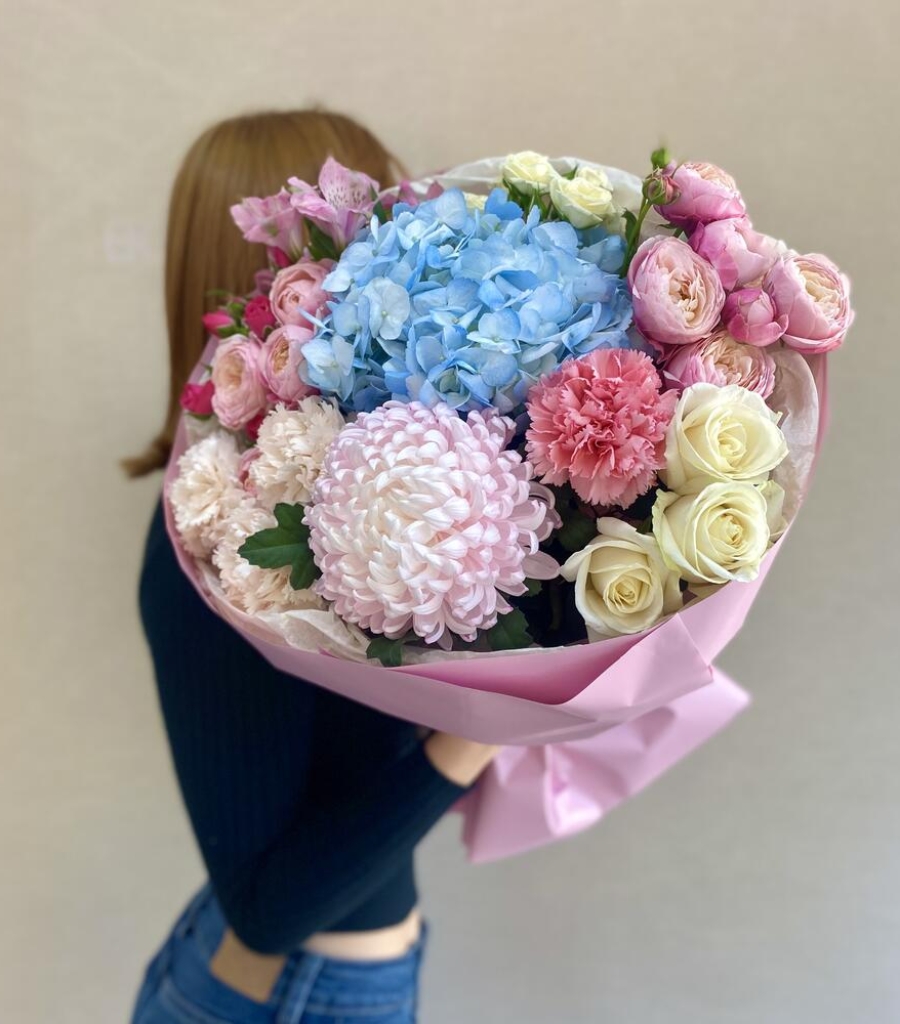 Роза Аваланж - 3 шт. Гортензия голубая - 1 шт. Диантус персиковый - 3 шт. Роза кустовая Сильва Пинк - 2 шт. одноголовая хризантема розовая - 1 шт. роза спрей крымская - 2 шт. альстромерия микс - 1 шт.