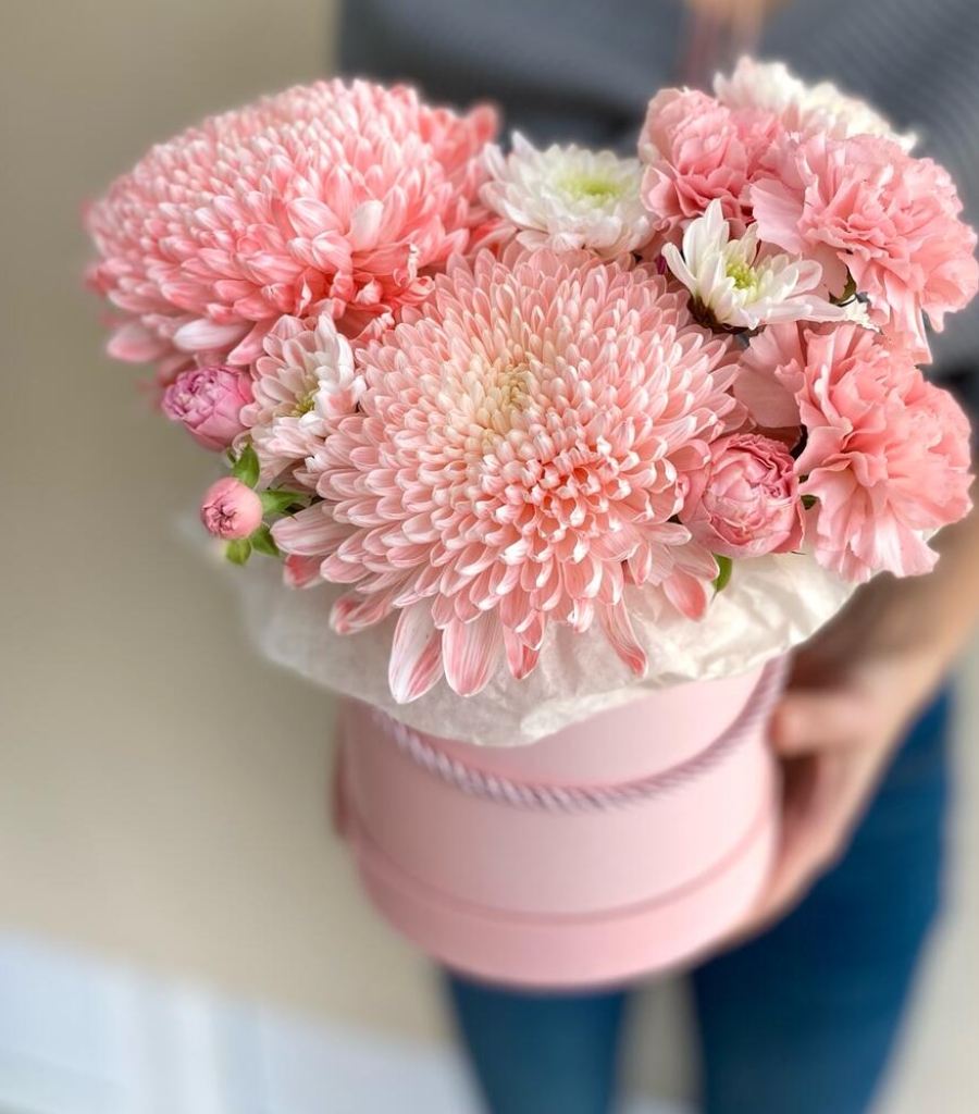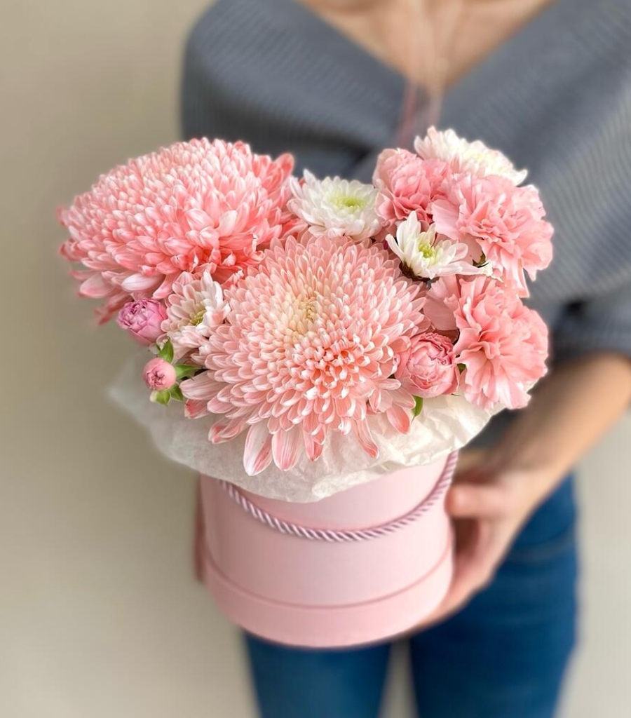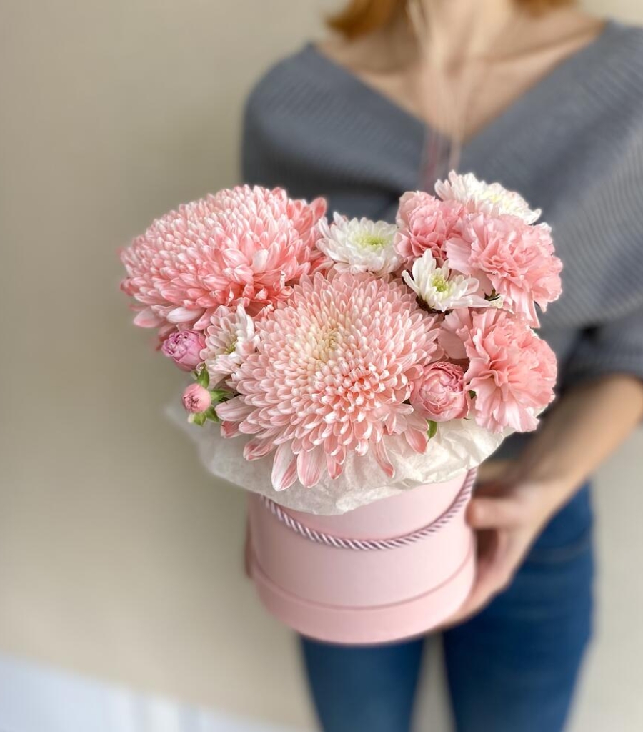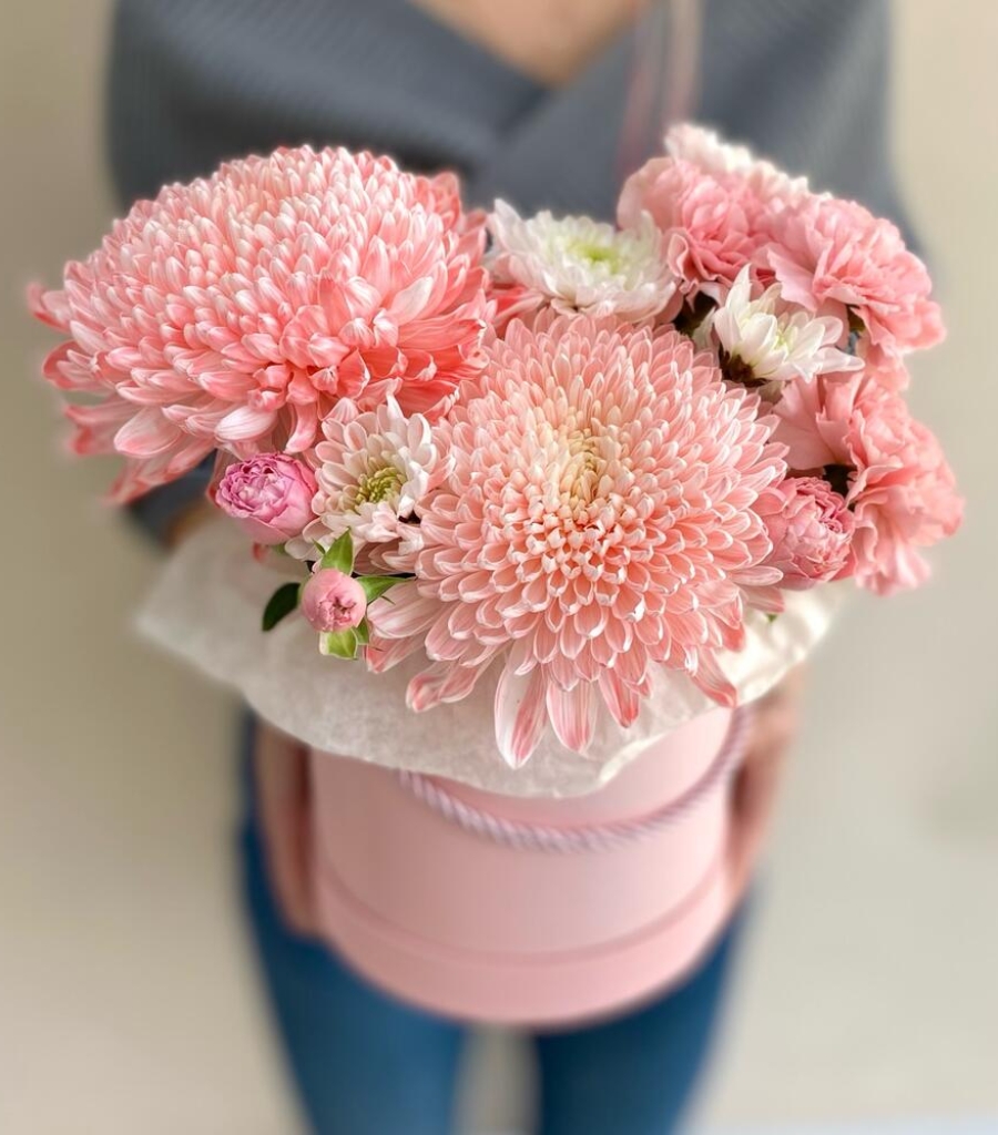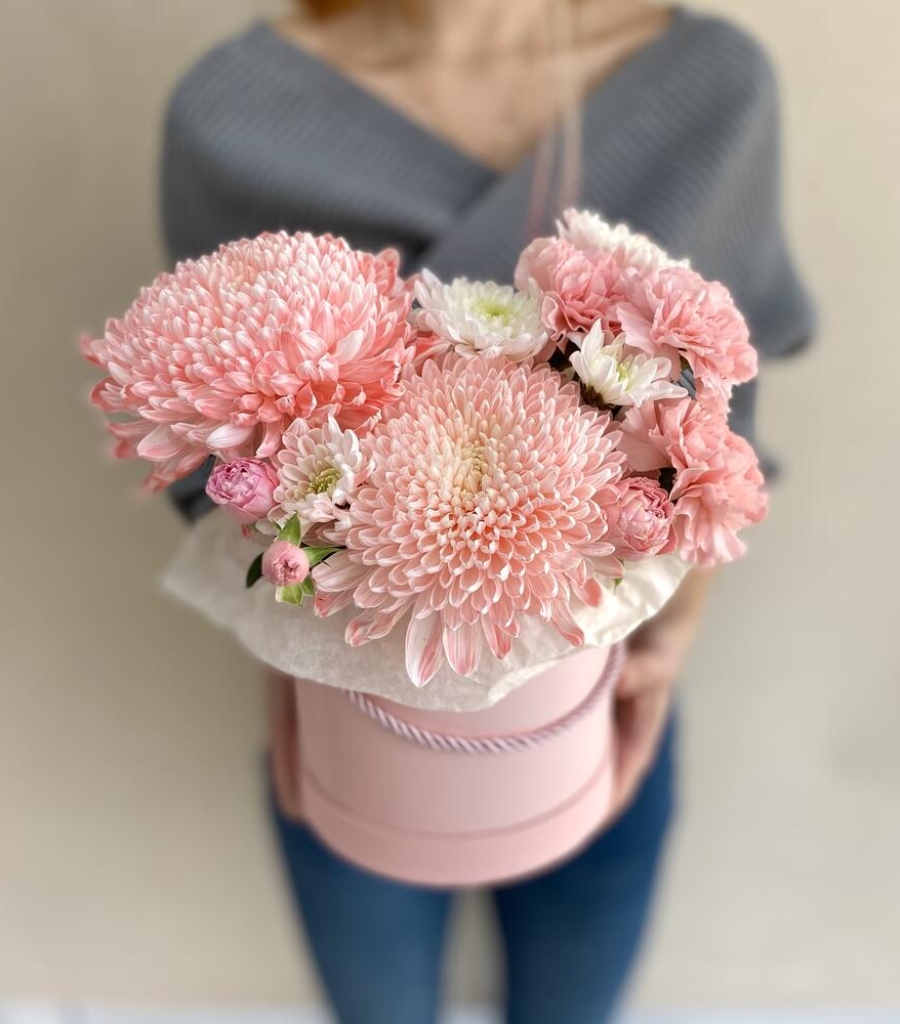 Роза кустовая - 1 шт. Коробка шляпная средняя - 1 шт. Диантус розовый - 3 шт. Хризантема одноголовая персиковая - 2 шт. хризантема балтика персиковая - 1 шт.